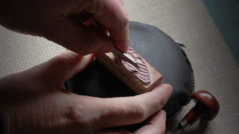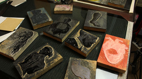 The cover images are engraved into maple endgrain blocks. The covers each have a hand painted heart detail